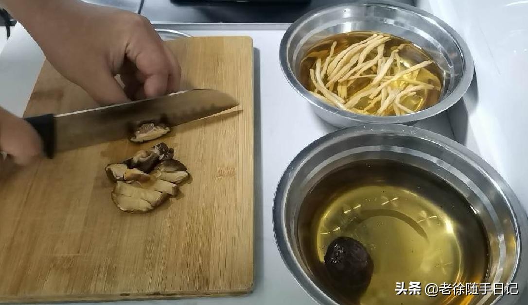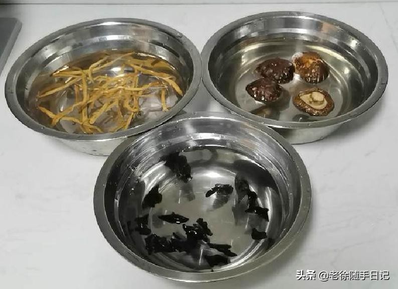 1.香菇、木耳、黄花菜用热水浸泡发开,洗干净,泡蘑菇的水不要倒掉(打卤用)。