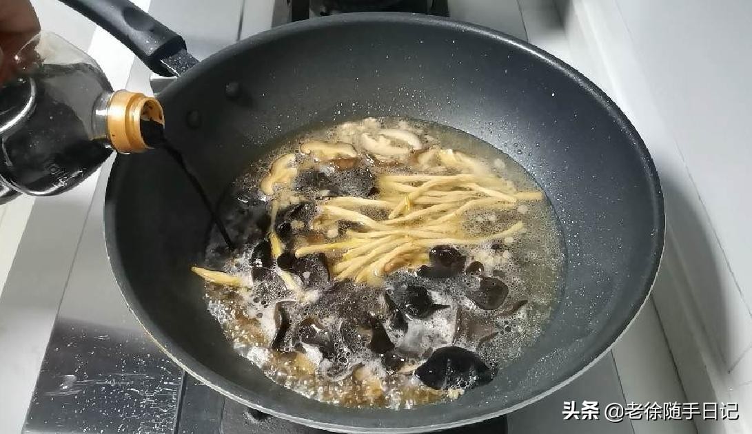 肉末炒熟后,加入泡香菇的水,然后依次放入香菇、木耳、黄花菜,加老抽、生抽、盐调味