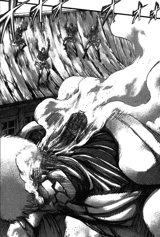 被出现的超大型巨人救了,缓了口气,再次变身,又被三笠韩吉等人的配合攻击,从嘴巴射入雷枪,再次干坐下了,这次直接被活捉,最后被车力巨人救走了。