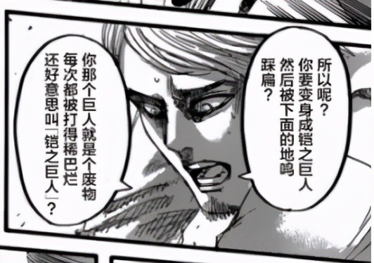 在众人从厄尔加德城堡脱险后,在城墙上对着艾伦自爆身份,直呼自己就是铠之巨人,全然不知自己被艾伦这帮人演了(人家早猜出你俩身份了,大哥),变身前大喊:就在这里决一死战,差点被三笠一刀带走