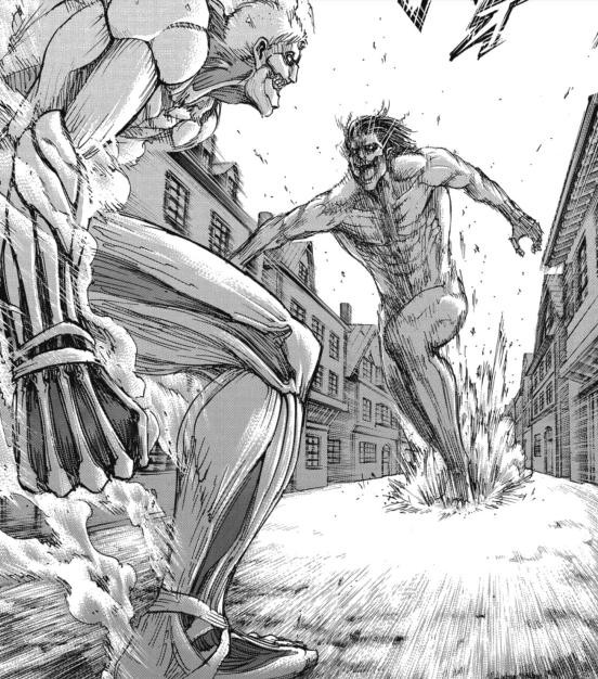 这次的变身与其说是巨人,更像人类,甚至脸部还是莱纳的模样,可能是因为心中不想战斗的缘故,被艾伦一拳打飞,但也夺回了颚之巨人,艾伦思量了一下后,选择撤退了