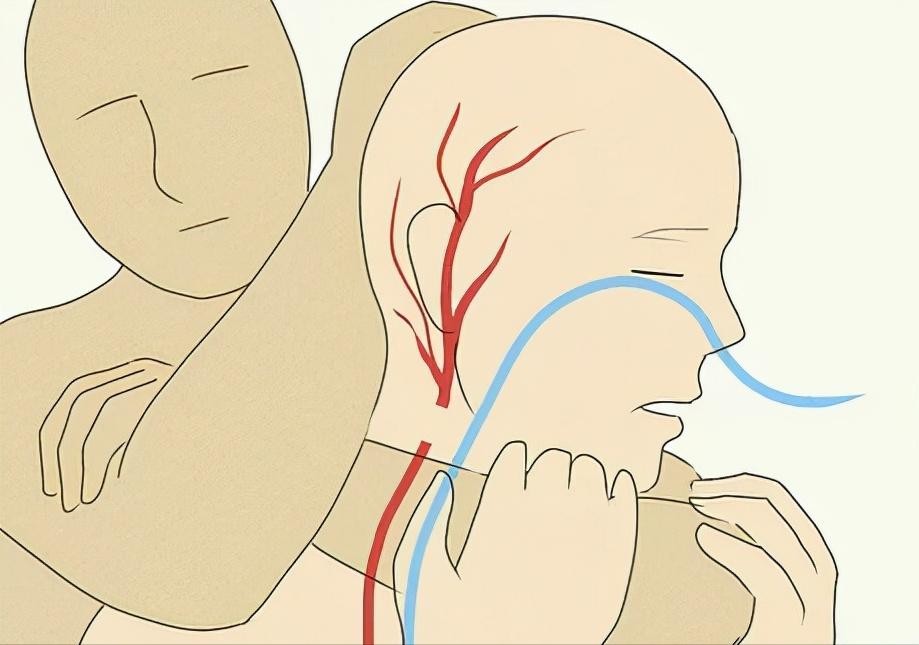 在压力的作用下动脉本身被阻塞,切断了大脑的氧气供应,使得大脑无法接受含氧血液,出现“大脑发作”——大脑含氧血液的突然减少会刺激人体的呼吸中枢强制吸气。这个时期持续1-1.5分钟。(长时间按压颈动脉也会导致心律失常,患有心脏病的人很可能心脏停止跳动)