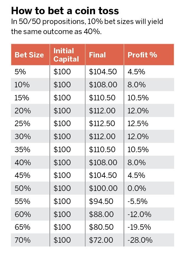 想要理解为何回报会先升後降,请先想像一个胜率50%、盈利比例在2∶1(即每押注1美元会获得2美元的回报)的很好的投资机会。
