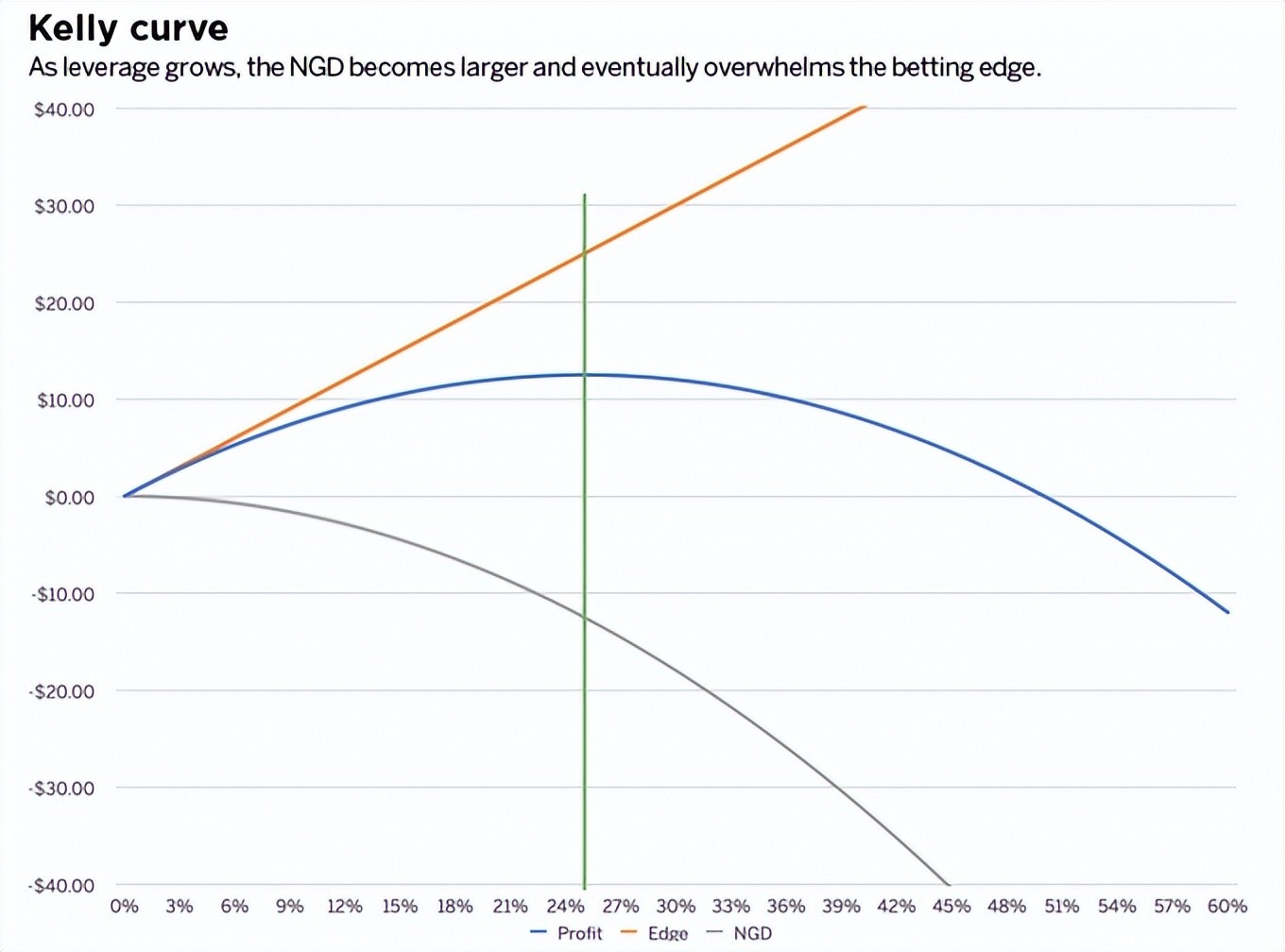 绿色的垂线代表Edge和NGD相互抵消的杠杆水平(即边际Edge=边际NGD),此时的押注比例在0.25,任何额外的杠杆都将导致利润下降。