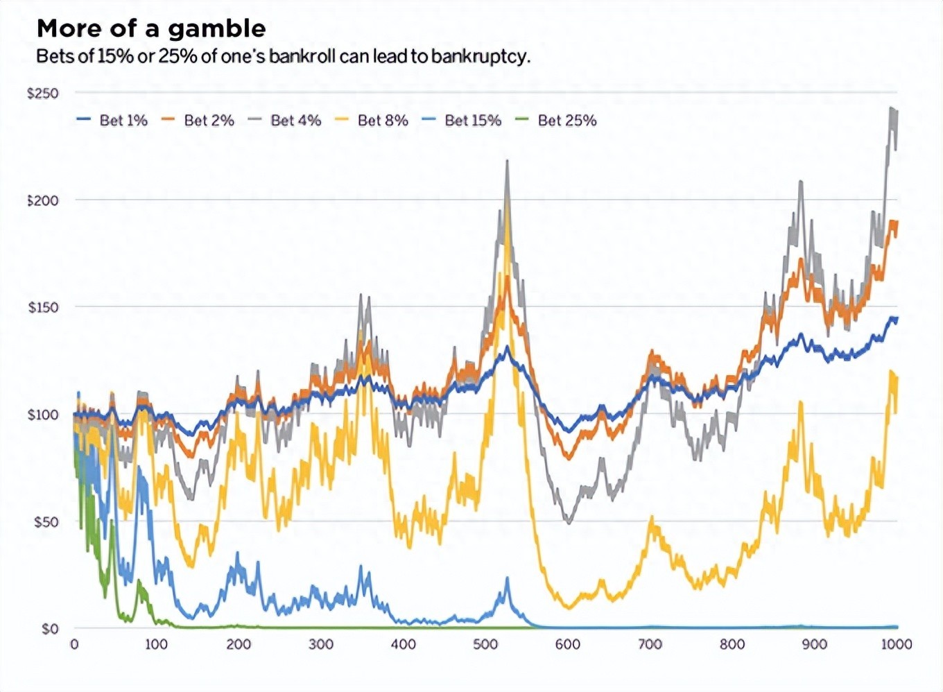 然而,随著押注比例从4%进一步增加至8%、15%和25%,在这一模拟实验中净资产数量却开始反转下行。