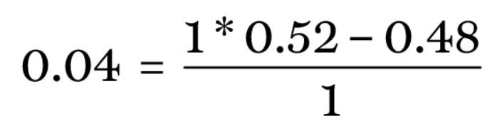 回到本文开始时的那个例子,将b=1,p=0.52,q=0.48带入可得∶