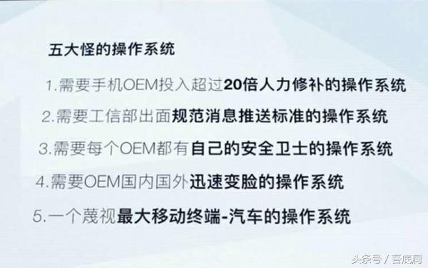 在此之前先来谈一谈Android。“当前存在一个有五大怪的操作系统:它是一个需要手机OEM投入超过20倍人力修补的操作系统;一个需要工信部出面规范消息推送标准的操作系统;一个需要每个OEM都有自己的安全卫士的操作系统;一个需要OEM国内国外迅速变脸的操作系统;一个蔑视最大移动终端—汽车的操作系统。 ”谁都知道,阿里巴巴集团技术委员会主席王坚在YunOS 6发布会上的这番话指的是Android。