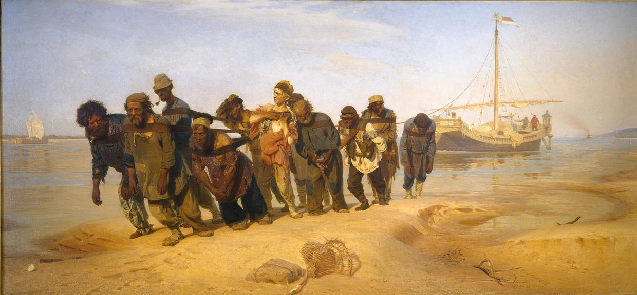 In 1868, when sailing on the River Neva in St Petersburg, Ilya Repin caught his first glimpse of men hauling barges. He was stunned at the sight of these unfortunate people in harness, in contrast to the elegant public promenading on the embankments.