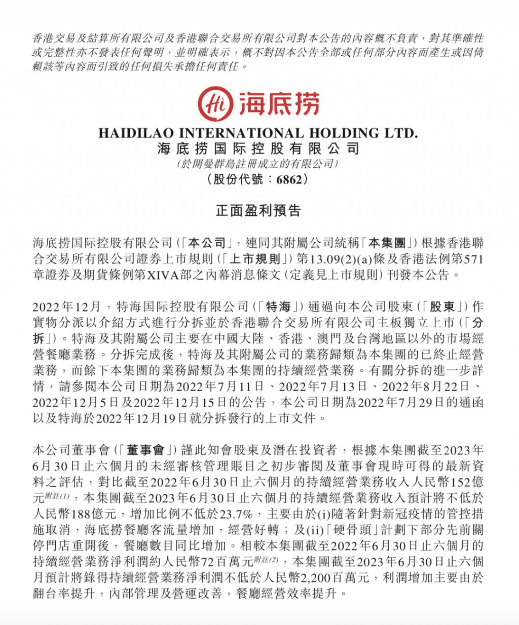 7 月 30 日,海底捞发布了一份亮眼的半年业绩预告,截至 2023 年 6 月 30 日,海底捞来自持续经营业务的收入预计不少于 188 亿元,较上年同期增幅超过 23.7%;净利润预计不低于 22 亿元,相较去年上半年的持续经营业务净利润约 7200 万元,同比增长近 30 倍。