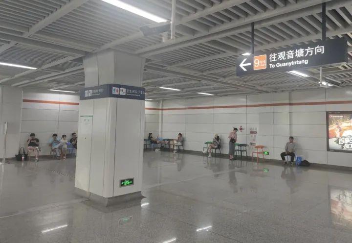 从 9 号线 B 口乘坐扶梯来到二楼,阵阵凉意扑面而来,步行二三十米之后就能看到 " 文明纳凉区 " 的指示牌。与此同时,广播里正循环播报着语音:乘客您好,请文明纳凉,勿影响他人正常出行,感谢您的配合。