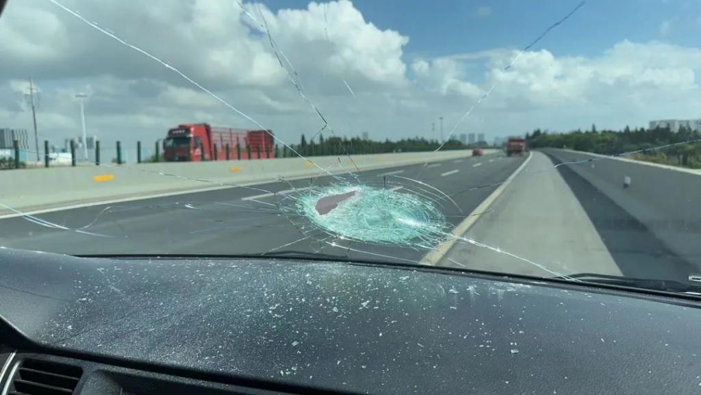 小伙晒出两张照片,一张是汽车挡风玻璃,被砸出了一个口子;另一张是被划伤的脸。