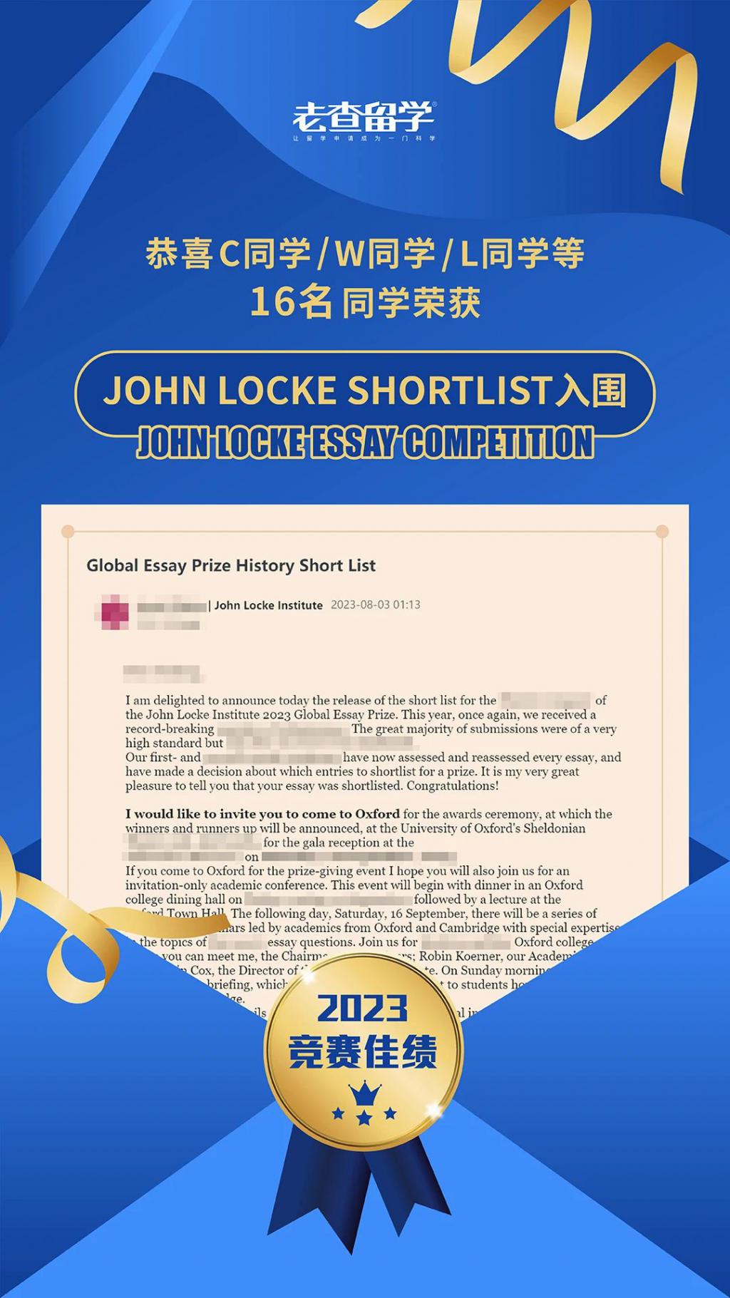 John Locke 入围名单公布!恭喜老查留学 16 位同学成功入围 2023 John Locke 全球论文竞赛的 Shortlist 获奖名单!