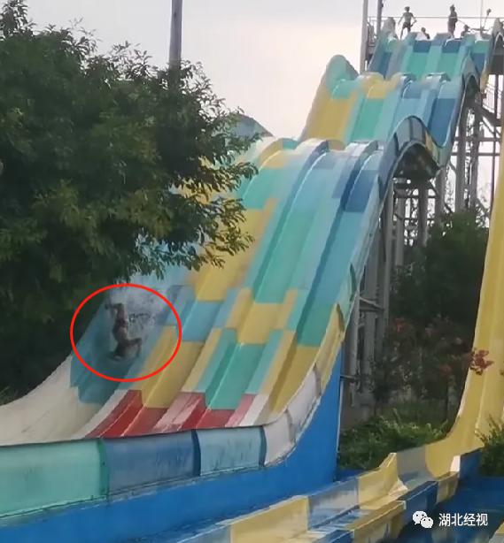 现场视频显示,一名男孩从近 10 米高的三阶水上滑梯俯冲下滑,下滑至最低滑阶时,男孩疑似被卡住,从滑垫上弹起,又重重摔回滑道。