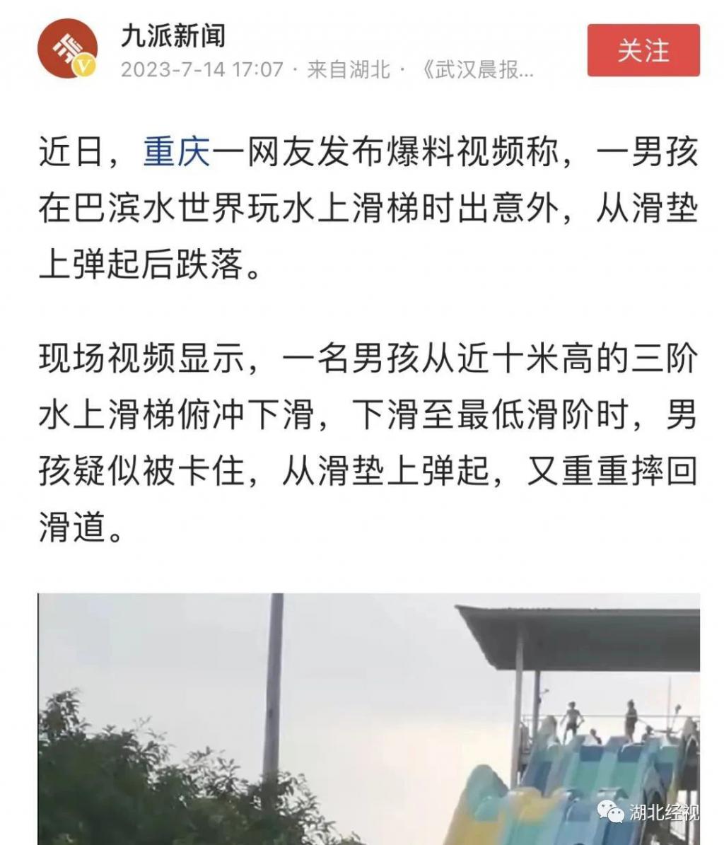 近日,重庆一网友发布爆料视频称,一男孩在巴滨水世界玩水上滑梯时出意外,从滑垫上弹起后跌落。