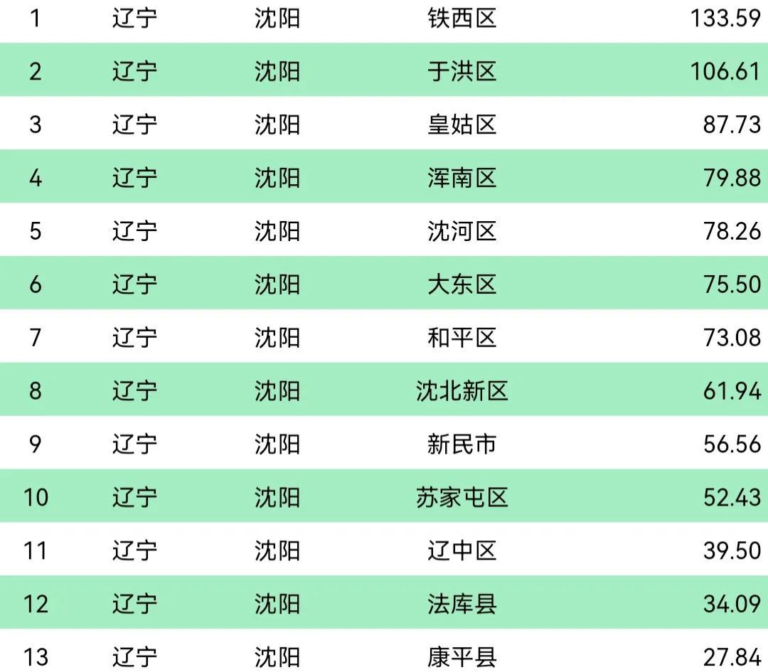 目前,沈阳共下辖10个市辖区、1个县级市、2个县,共13个区县。人口在百万以上的共有2个,分别是铁西区和于洪区。