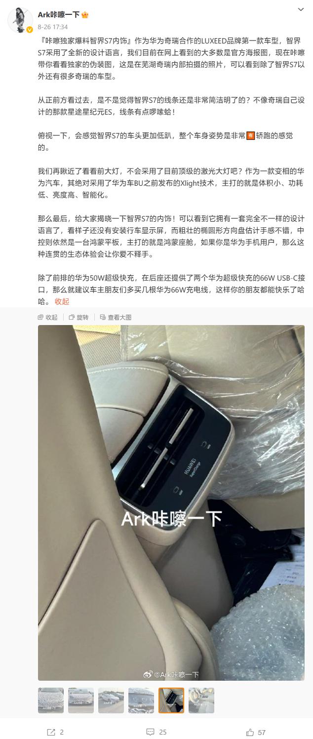 IT 之家 8 月 31 日消息,余承东在月初预热的那款奇瑞合作车型 —— 智界 S7,神秘面纱正一点一点被揭开,继此前完成工信部申报之后,微博博主 @Ark 咔嚓一下 这几天又放出了这款车内饰的更多信息。