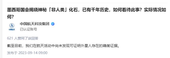 9 月 14 日上午,中国航天科技集团官方在知乎相关问题下作出回答:" 截至目前,我们在航天活动中尚未发现可证明外星人存在的确凿证据。"