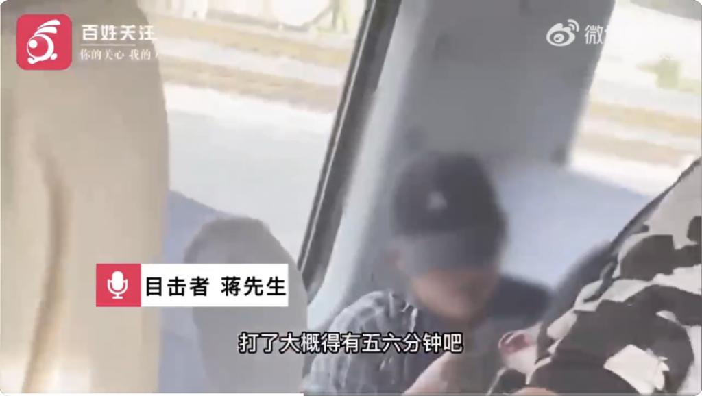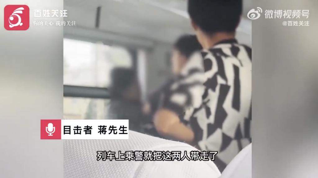 目击者蒋先生称男生身体不舒服,一直在咳嗽,女生就暴起打该男生的头,打了大概得五、六分钟,该男生没有还手,女生边骂边打,列车上的乘警将两人带走。