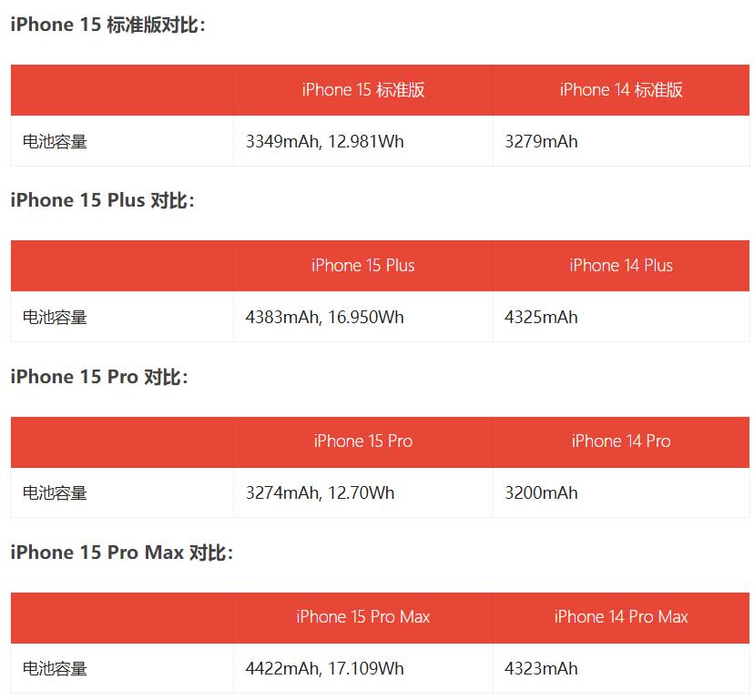 IT 之家从苹果官方获悉,这一代 iPhone 15 系列机型均采用了比 iPhone 14 系列更大的电池,但续航时间并没有任何改进。