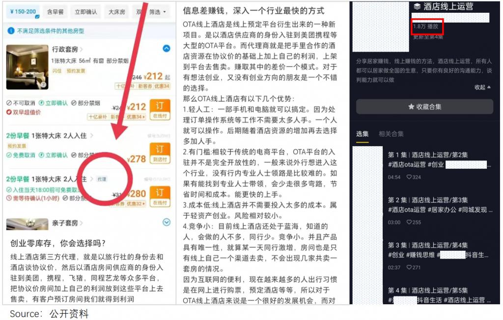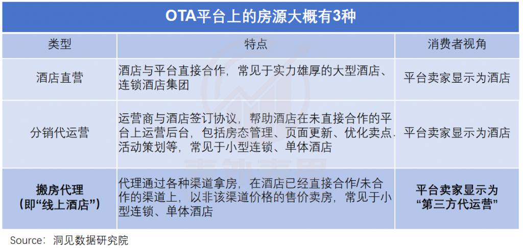 而在线上 OTA 平台,主要有 2 种代理,一种是他所从事的分销代运营,另一种就是所谓的 " 线上酒店 ",业内称之为搬房代理。