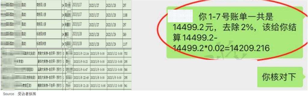 " 他们主要做单体酒店,也有一些连锁酒店,订单金额从 100-5000 元不等。" 凌玲说,群里代理们每隔一周会结算一次,大代理抽取交易金额的 2% 后给小代理返现。