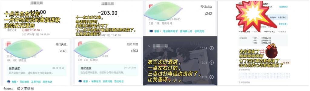 确定好行程后,嘉佳提前半月开始订酒店,结果刚下单,就秒被退回了。那之后,在 2 个不同平台,她又因 " 满房 " 等理由被拒了 4 次,但页面分明显示有房。