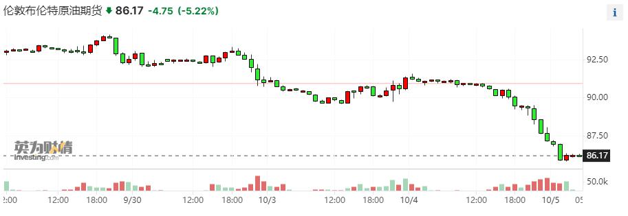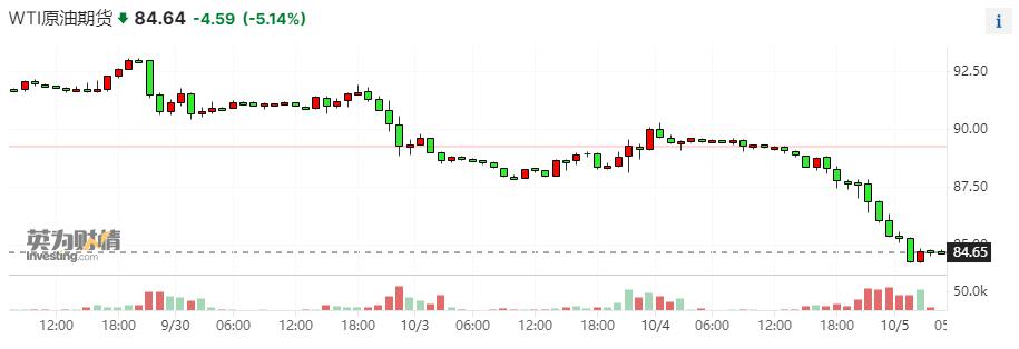具体行情显示,美国 WTI 原油期货 11 月合约结算价收跌 5.61%,报 84.22 美元 / 桶,创去年 9 月以来最大单日跌幅;布伦特原油期货 12 月合约结算价跌 5.62%,报 85.81 美元 / 桶。