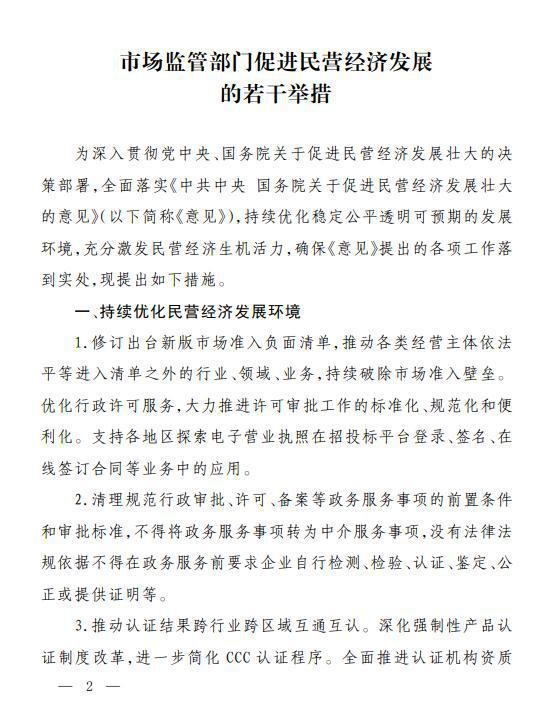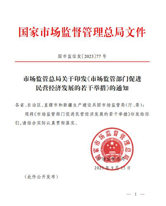 经济观察网讯 据市场监管总局网站 9 月 22 日消息,9 月 18 日,市场监管总局正式发布《市场监管部门促进民营经济发展的若干举措》。这是 7 月 14 日《中共中央 国务院关于促进民营经济发展壮大的意见》出台以来,市场监管部门贯彻落实党中央、国务院决策部署出台的制度举措,对提振民营经济发展信心,依法规范和引导民营资本健康发展具有重要意义。