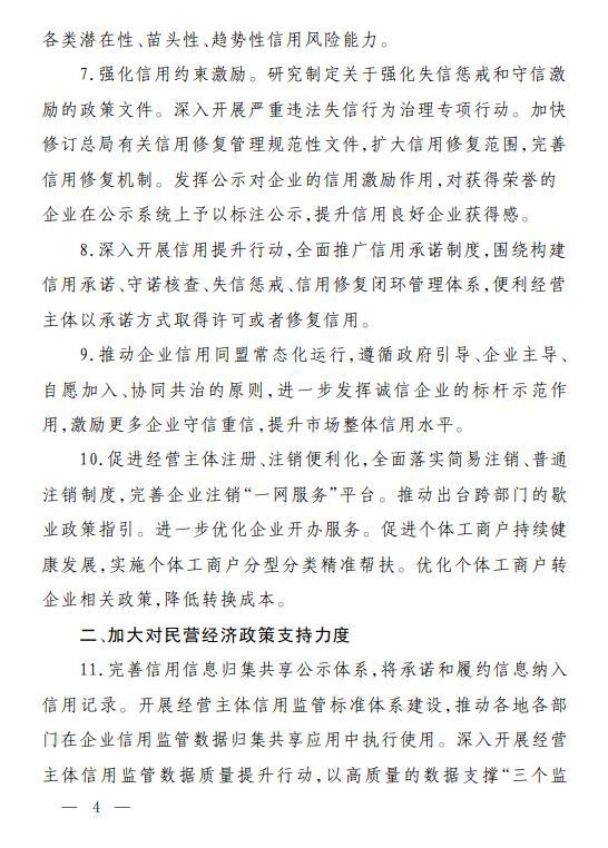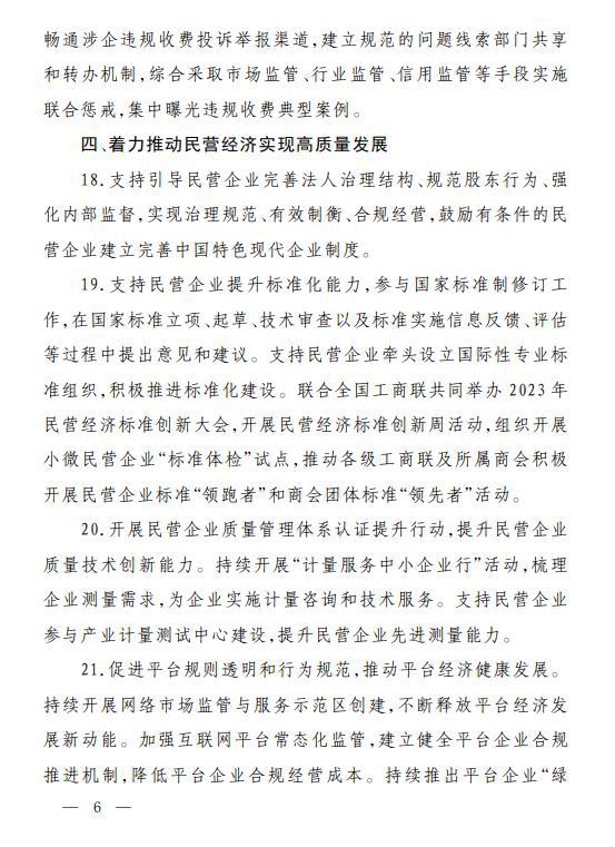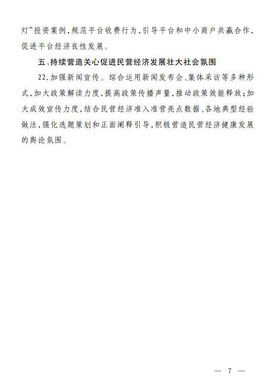 22 条举措聚焦五个方面,落实《意见》部署要求,回应了民营经济各类关切:一是持续优化民营经济发展环境。持续破除市场准入壁垒,全面落实公平竞争政策制度,强化制止滥用行政权力排除、限制竞争的反垄断执法,完善社会信用激励约束机制,健全失信行为纠正后的信用修复机制。二是加大对民营经济政策支持力度。完善信用信息归集共享,健全中小微企业和个体工商户信用评级和评价体系。完善支持政策直达快享机制。三是强化民营经济发展法治保障。持续完善知识产权保护体系,完善监管执法体系,杜绝选择性执法,健全涉企收费长效监管机制。四是着力推动民营经济实现高质量发展。支持民营企业参与标准制定,计量服务中小企业。依法规范和引导民营资本健康发展,推动平台经济健康发展。五是持续营造关心促进民营经济发展壮大社会氛围,及时推广经验做法,加大宣传。