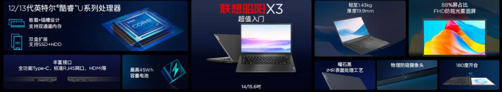 另外,昭阳 X3 系列笔记本则为入门定位,外观上延续简约设计风格,采用 IMR 表面处理工艺打造的 " 曜石黑 " 商务经典配色。在性能上,联想昭阳 X3 搭载了 intel12 代酷睿或 13 代酷睿处理器,支持 SSD+HDD 双盘扩展,保障性能稳定释放;与联想昭阳 X5、X7 具备同样的安全功能、丰富接口等商用设计,满足绝大多数办公应用场景需求。