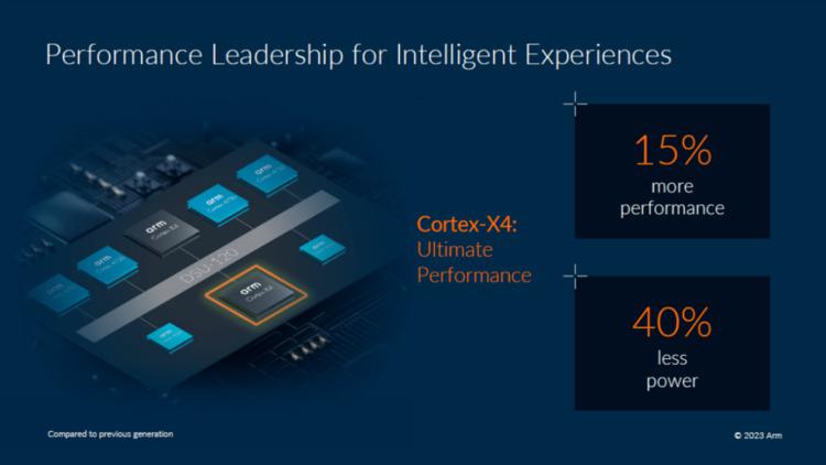 而且根据 Arm 公布的信息来看,基于 Armv9 的 Cortex-X4 超大核将再次突破智能手机的性能极限,相比 X3 性能提升 15%, 基于相同工艺的全新高能效微架构可实现功耗降低 40%。而 Cortex-A720 将成为明年主流的大核,可提高移动芯片的持续性能,是新 CPU 集群的主力核心。