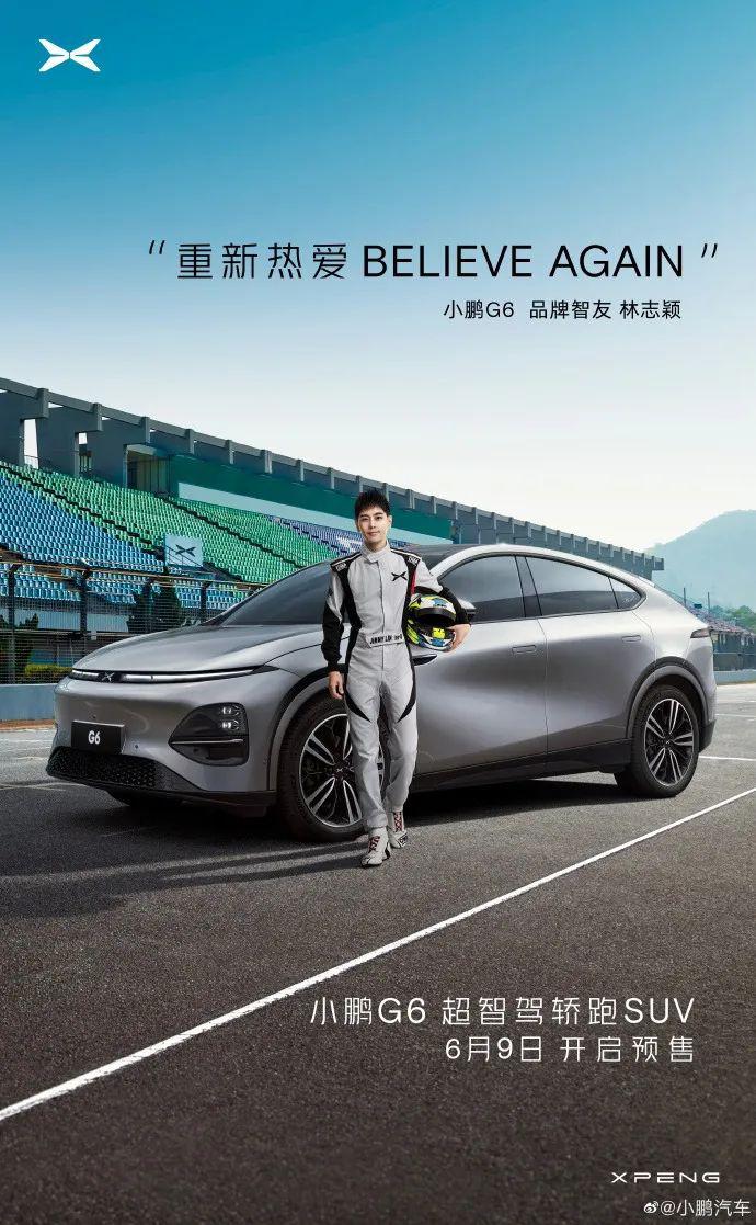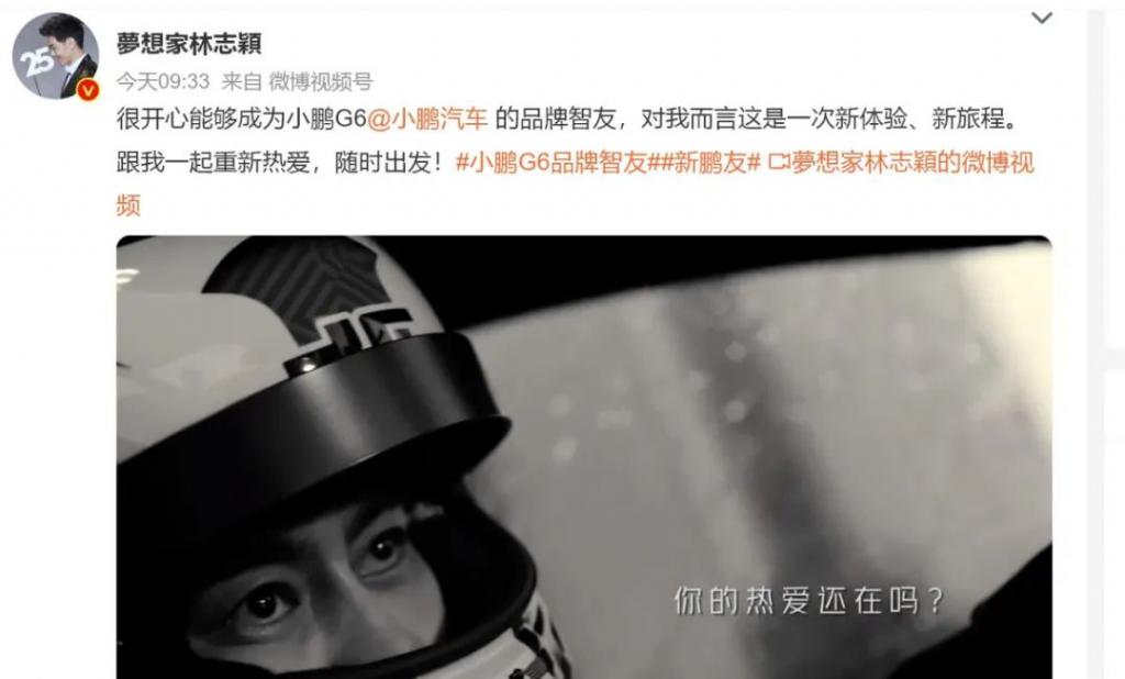 6 月 6 日,小鹏汽车官方发布微博,表示 " 林志颖成为小鹏 G6 品牌智友,新鹏友,新体验,新旅程 "。