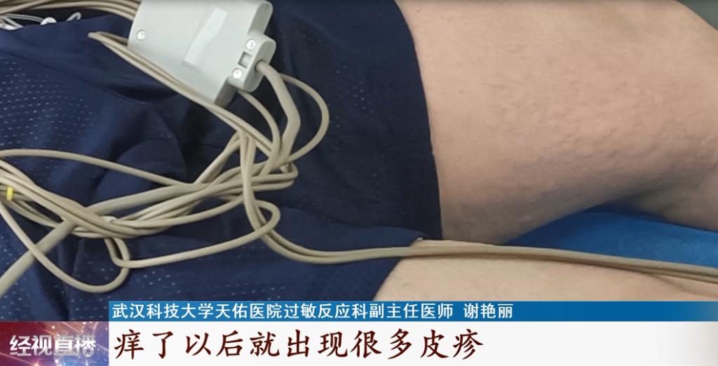 医生介绍,梁先生当天吃了热干面后,约他朋友一起出去打球,打了不到 1 个小时,全身开始出现瘙痒,出现很多皮疹,从腿、胸部包括脸上全部都是,范围非常大,最后被人送医。