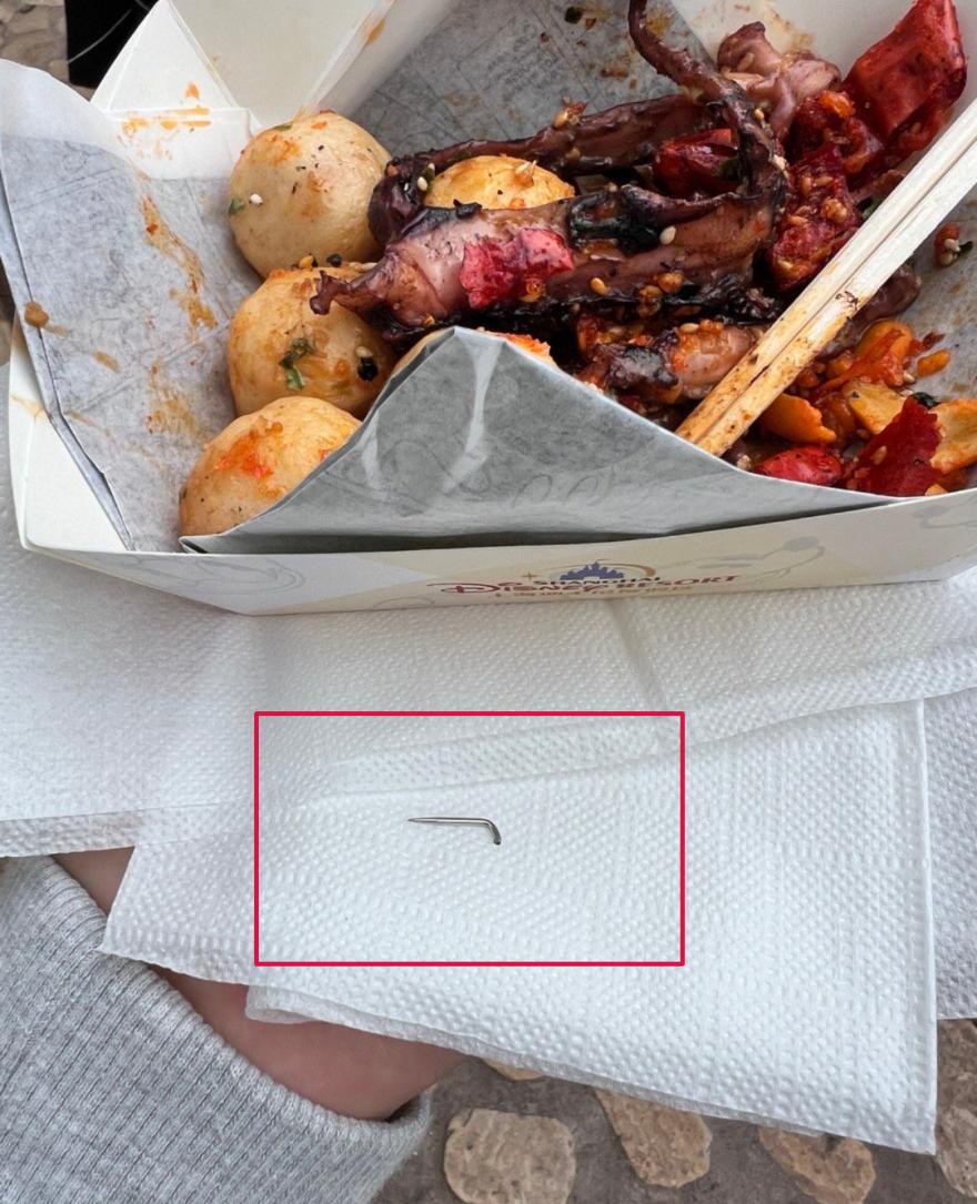 10 月 9 日,有网友称,在迪士尼乐园的海怪小吃摊位购买了一份鱿鱼蛋,不料竟在其中吃到了一枚弯曲的钉子!