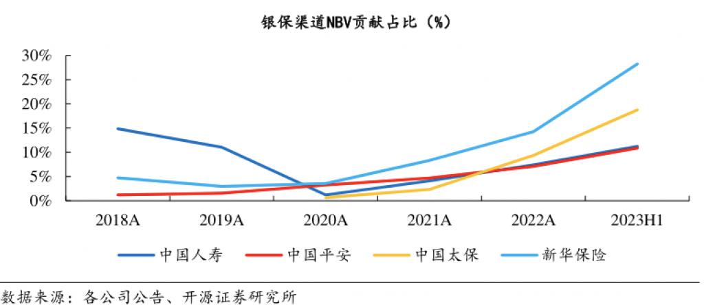 从上市险企来看,2023 年上半年上市险企新单保费及新业务价值贡献显著上升。中国平安、中国太保、中国人寿、新华保险银保渠道新单保费同比增速分别为 120.7%、2.8%、116.8% 和 17.7%,银保渠道新业务价值同比增速分别达到 174.7%、305.0%、121.8% 和 202.6%。