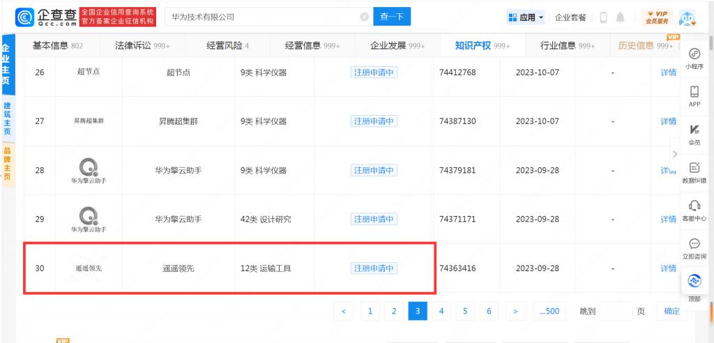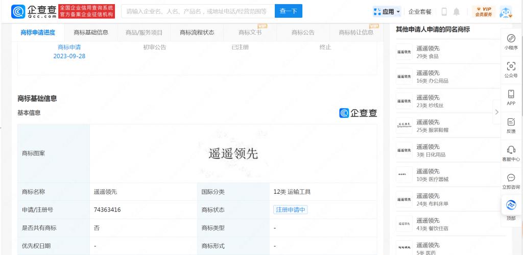 据企查查数据显示,近日,华为技术有限公司申请注册 " 遥遥领先 " 商标,国际分类为运输工具、科学仪器,当前商标状态为等待实质审查。