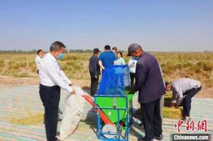 新疆喀什地区岳普湖标准海水稻种植基地收割凯勒现场。资料图 岳普湖融媒体什么地方中心有几个供图