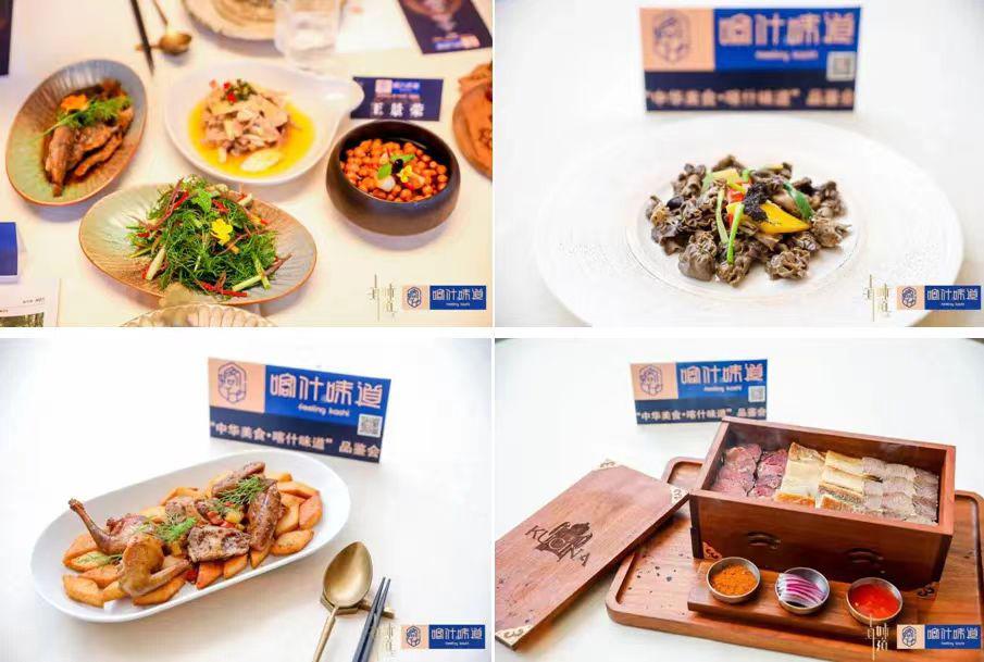 定制宴发布现场,10 位新疆菜名厨、主理人,耶里夏丽、爱特籁丝、艾尼巴亿、疆域时光特夏等喀什味道推广大使,每一位都在新疆菜、新疆美食领域耕耘十年以上。定制宴推出【意大利黑醋泡鹰嘴豆】、【黑松露炒野生巴楚菇】、【酥馕炒妙龄乳鸽】、【招牌酸奶手抓饭】四大喀什味道招牌菜式,采用喀什、巴楚等当地独有食材,中西烹饪手段结合,获得满堂喝彩。同时 " 穿越阿勒泰 "" 一根烤马肠 " 等独特西域风味菜式,摆盘、装饰、迷迭香熏制,各种独特喀什烹饪手法,引得满堂喝彩。