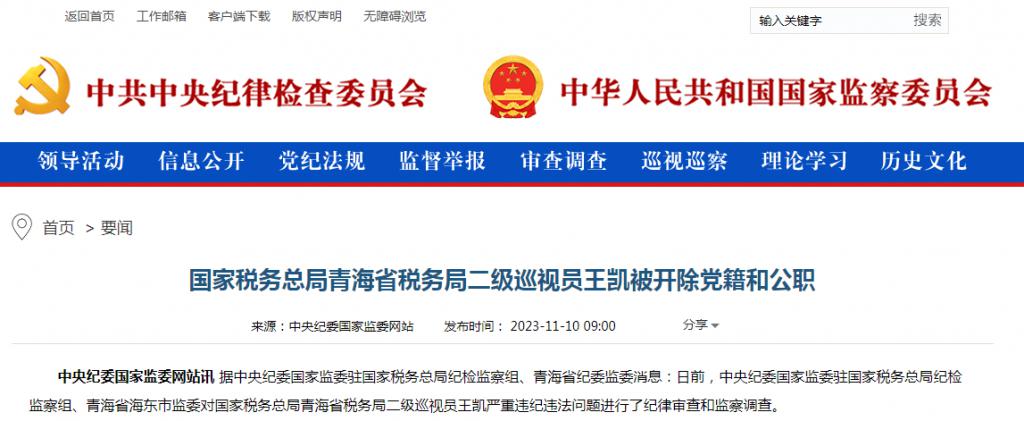 据中央纪委国家监委网站 11 月 10 日消息, 日前,中央纪委国家监委驻国家税务总局纪检监察组、青海省海东市监委对国家税务总局青海省税务局二级巡视员王凯严重违纪违法问题进行了纪律审查和监察调查。