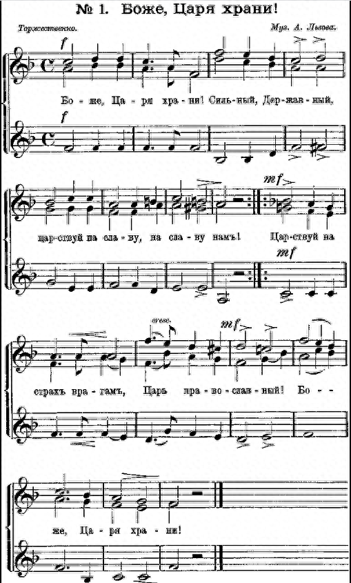 1816年俄国在打败拿破仑的法兰西第一帝国之后,沙皇亚历山大一世建议为俄罗斯帝国正式谱写一首国歌做为胜利的纪念。因为时间紧、任务重,下面的人直接袭用英国国歌《天佑吾王》的曲调,只是歌词由瓦西里·茹可夫斯基撰写,做为俄罗斯帝国从1816年至1833年之间的国歌,歌名为《俄罗斯人的祈祷》(俄语:Молитва русских, Molitva russkikh)。