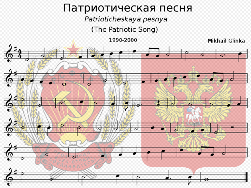 1991年苏联解体后,俄罗斯联邦改为使用米哈伊尔·格林卡的《爱国歌》(Патриотическая Песня)作为国歌,此曲为米哈伊尔·格林卡所作,创作于1833年。原为一段没有配词的钢琴旋律,并且被配上“Motif de chant national.”的法文标题。