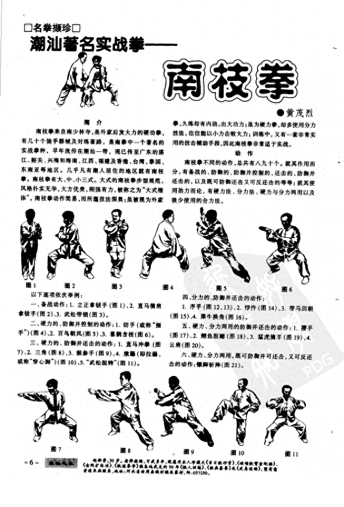 八、南枝拳陈南枝(1847-1925),原籍广东海丰,壮年移居妻家揭阳南山区(今揭西县),从小酷爱武术,练得一手拳脚,参加舞狮队,又拜武林名师松先生为师。陈南枝集各家之长,创造出具有独特风格的南枝拳。南枝拳广泛流传在粤东一带。他的门人弟子在辛亥革命、抗日战争和解放战争中贡献了力量。
