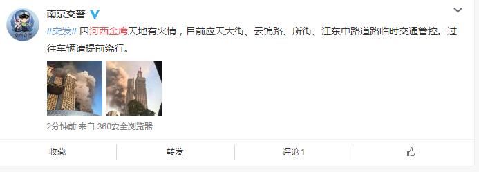 【应天大街、云锦路、所街、江东中路道路临时交通管控】南京交警发布微博称:因河西金鹰天地有火情,目前应天大街、云锦路、所街、江东中路道路临时交通管控。过往车辆请提前绕行。
