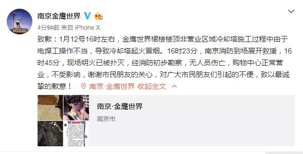 【南京金鹰世界官微:向广大市民朋友们致歉】致歉:1月12号16时左右,金鹰世界裙楼楼顶非营业区域冷却塔施工过程中由于电焊工操作不当,导致冷却塔起火冒烟。16时23分,南京消防到场展开救援,16时45分,现场明火已被扑灭,经消防初步勘察,无人员伤亡,购物中心正常营业,不受影响,谢谢市民朋友的关心,对广大市民朋友们引起的不便,致以最诚挚的歉意!