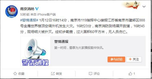 【南京消防警情通报:火灾已扑灭无人员伤亡】1月12日16时14分,南京市119指挥中心接报江苏省南京市建邺区888号金鹰世界楼顶空调外机发生火灾。16时23分,南京消防到场展开救援,16时45分,现场明火被扑灭。经初步勘查,过火面积60平方米,无人员伤亡。