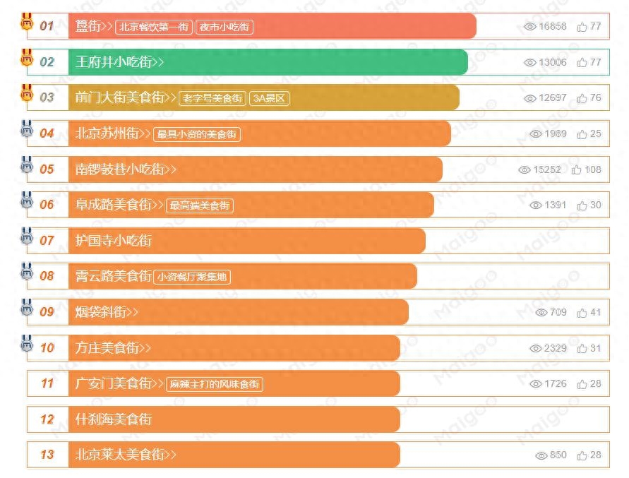 北京饮食文化内涵丰富,几千年的文化底蕴在这里传承,街道美食是北京饮食的标志,那么,北京美食街哪里最出名?北京哪里的小吃街最地道呢?MAIGOO小编整理了北京十大美食街及排行榜,包含了北京有名的小吃街、夜市街等美食街,其中北京比较出名的美食街有王府井小吃街、簋街、前门美食街、霄云路美食街、阜成路美食街、南锣鼓巷小吃街、苏州街、护国寺小吃街、广安门美食街、方庄美食街等等,一起来看看吧。