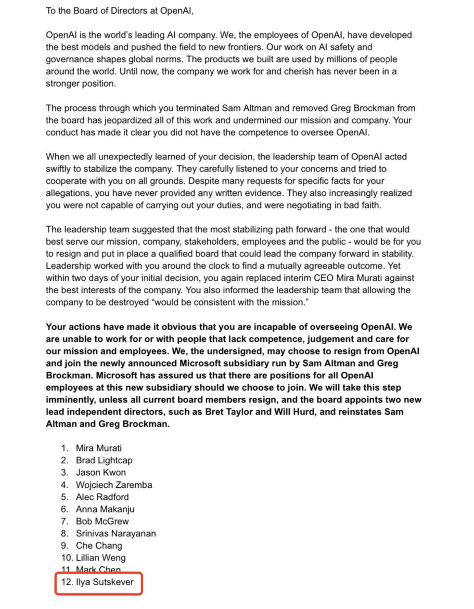你们的行为表明,你们没有能力监管 OpenAI。我们无法为那些缺乏能力、判断力以及对我们的使命和员工缺乏关心的人工作或与之共事。我们可能选择从 OpenAI 辞职,加入刚宣布的由奥特曼和布罗克曼运营的微软子公司。微软已经向我们保证,如果我们选择加入,这个新的子公司将为所有 OpenAI 员工提供职位。我们将很快采取这一步骤,除非所有现任董事辞职,董事会任命如布雷特 · 泰勒(Bret Taylor)和威尔 · 赫德(Will Hurd)这样的两名新首席独立董事,并恢复奥特曼和布罗克曼的职务。(无忌)