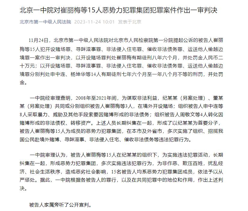 据媒体报道,北京市第一中级人民法院通报中的纪某某就是活跃于港澳赌场的纪晓波,而通报提及的崔丽梅是纪晓波母亲崔丽杰的妹妹。