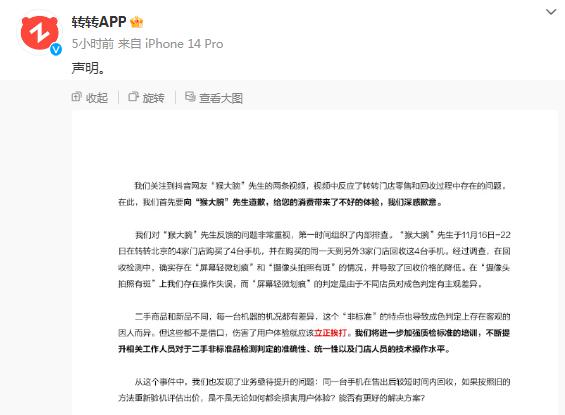 11 月 29 日,转转通过官方微博 @转转 APP 向猴大腕道歉并表示,在回收检测中,手机确实存在 " 屏幕轻微划痕 " 和 " 摄像头拍照有斑 " 的情况,这导致回收价格有所降低。