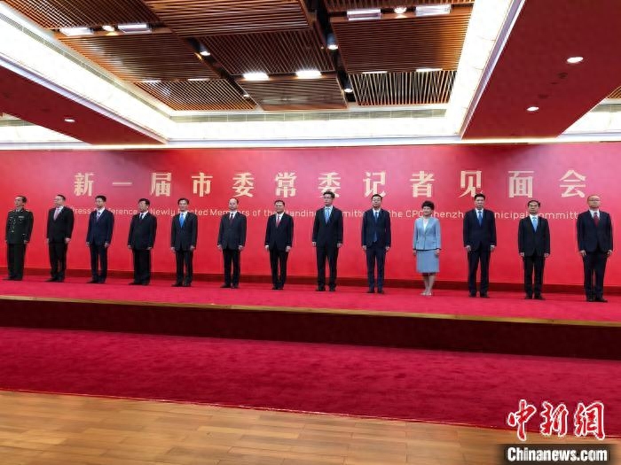 图为深圳新一届市委常委记者见面会现场,十三名深圳市委常委亮相。 朱族英 摄